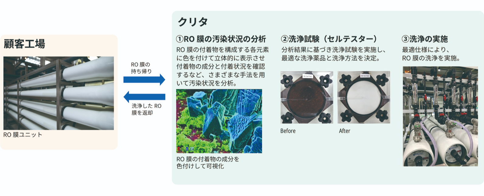 クリタグループは、「OSCAR(Off-Site Cleaning and Restoration)」サービスを用いたNF膜のオフサイト洗浄・再生を提案しました。本サービスは、当社グループの工場で、洗浄に最適な流量・水温・洗浄圧力となるよう特別に設計された洗浄ユニットによりさまざまな洗浄剤を用いて使用済みの膜を洗浄し、洗浄前と洗浄後の性能試験により性能の回復確認までを実施するものです。従来の処理では再生が見込めず廃棄するしかなかった膜であっても、新品に近いレベルまで性能を回復することが可能です。