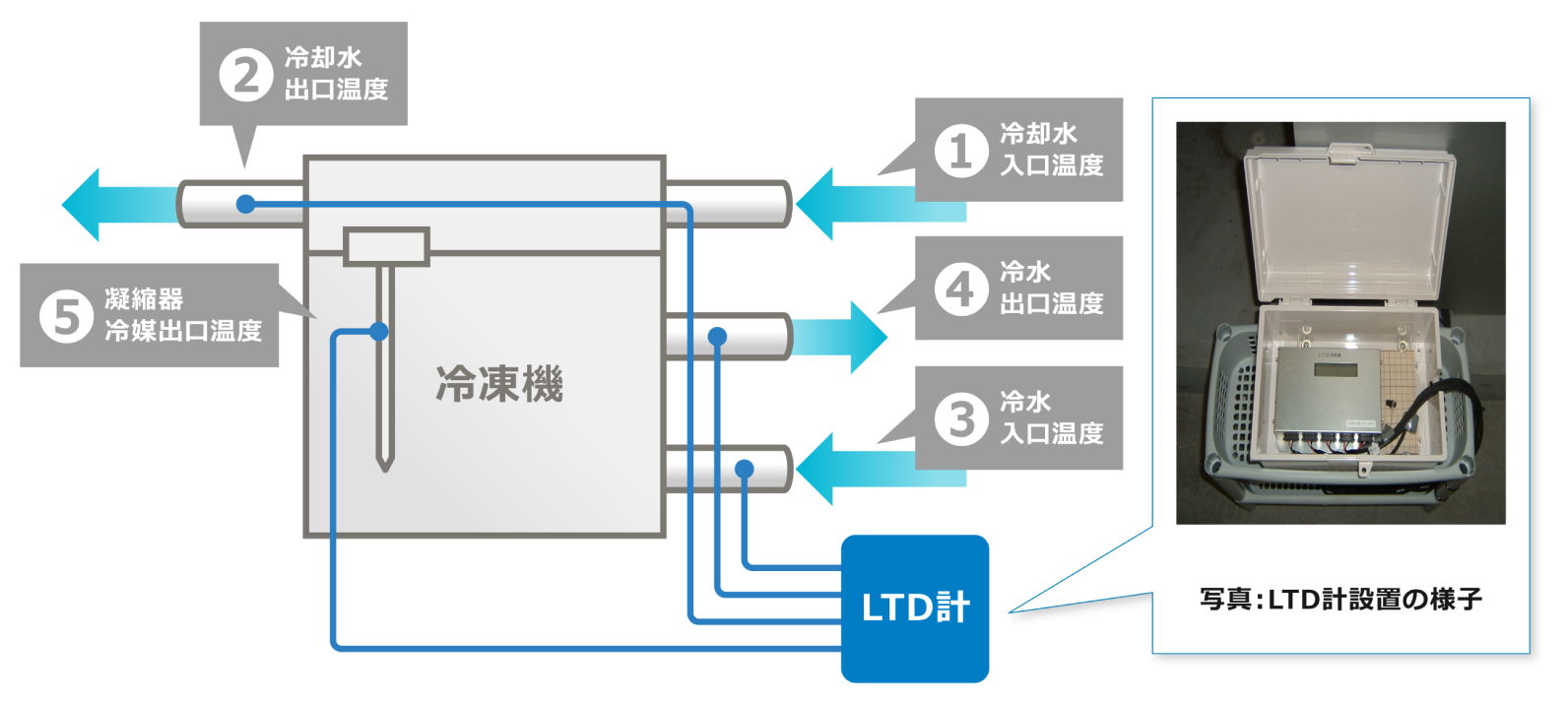 冷凍機の熱交換器の熱伝達率は、冷媒出口温度と冷却水出口温度の差を示すLTD(Leaving Temperature Difference)により数値化することができます。冷凍機の熱交換器にスライムなどの汚れが付着すると、熱伝達率が低下して温度差が大きくなり、LTDが上昇します。このLTDを常時監視し、エネルギーロスの定量化と、それにともなうGHG排出量を算出することで、お客様のGHG排出削減目標との差を可視化します。そのうえで、スライムをはじめとする三大障害の予防およびレジオネラ属菌の増殖を抑制する「Kurita NA」シリーズと、LTD計を用いて薬品注入量を自動制御するセンシング技術を組み合わせ、薬品注入量を最適化することで、冷凍機の高効率運転による電力使用量を削減し、GHGの排出を削減するとともに、衛生的な設備環境を維持します。