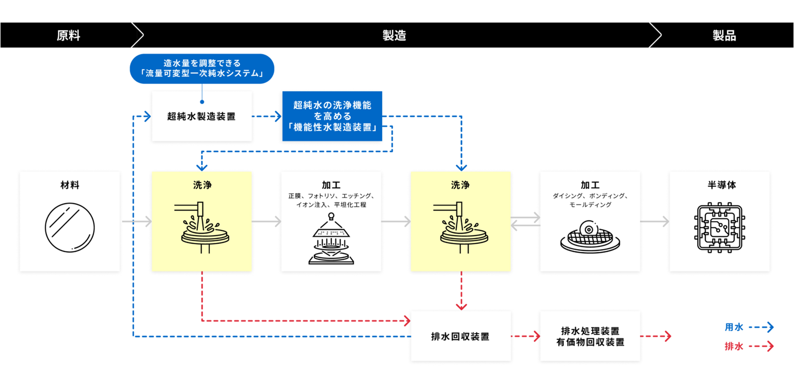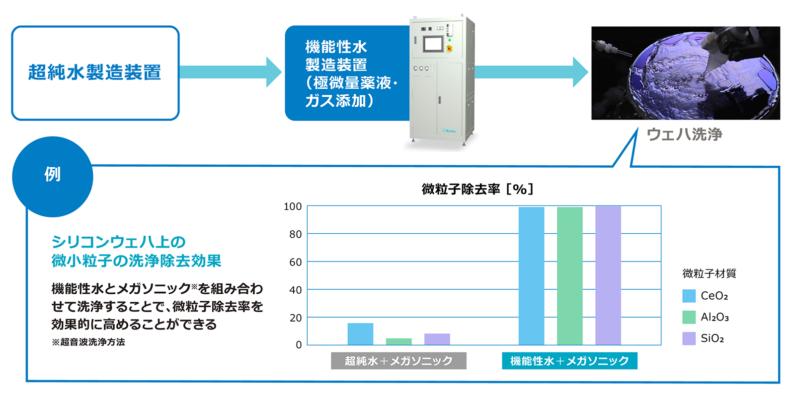 02. 超純水の不純物除去性能と材料溶解抑制効果を向上させる「機能性水製造装置」を適用し、洗浄薬品の使用量削減によるコストダウンと、節水、および歩留まりの改善に貢献