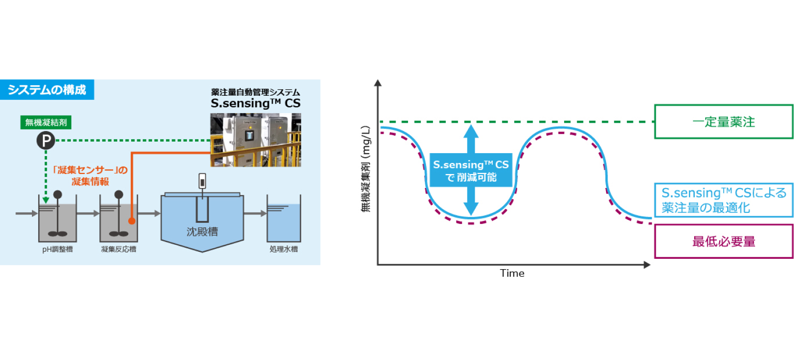 クリタグループ独自の凝集センサーを用いた薬品注入量自動管理システム「S.sensing CS」により、乳化剤の濃度変動にあわせて無機凝集剤の注入量の自動制御を高精度で行うことで薬品注入量を最適化し、手間をかけずに排水処理の安定化による安定操業と、薬品コストおよび薬品由来の汚泥発生量(資源投入量)の削減を両立します。また、少量の注入で凝集効果が得られる有機凝集剤「ゼーダエース™ P-702」を併用することで、無機凝集剤の注入量を大幅に削減し、薬品由来の資源投入量をさらに削減します。