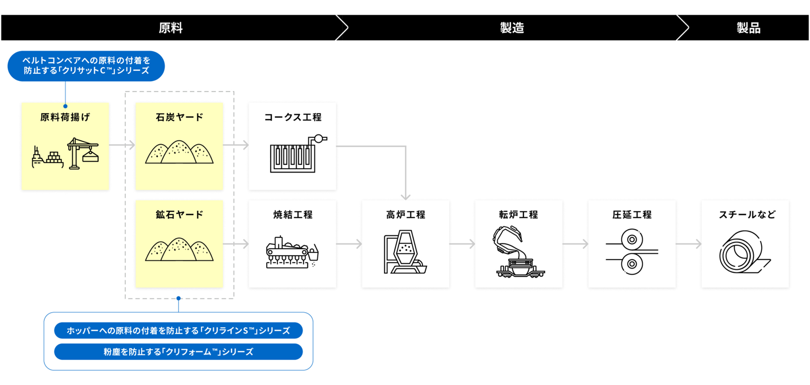 原料改質剤「クリラインS」シリーズは、原料表面の水分を吸収し付着性を低下させる作用により、搬送工程における製鉄原料の付着や、それによる閉塞、噴出を防止します。これにより、生産性の向上に加え、リサイクル原料の使用量を安定化させ、資源投入削減とコストダウンに貢献します。