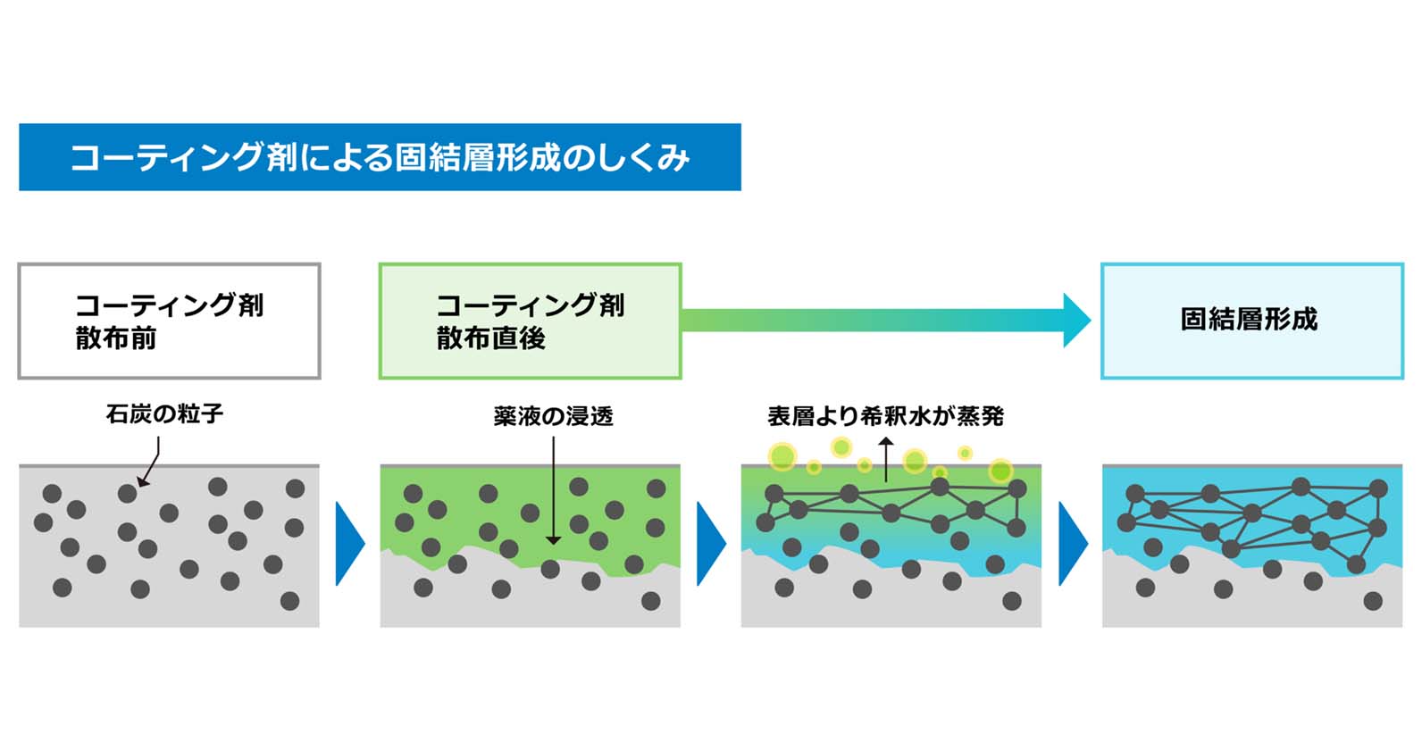クリタグループは、防塵と遮水効果をあわせもつコーティング剤や、保水性・発泡性をもつ防塵剤など、用途に合わせたさまざまなダストコントロール技術を提供し、環境負荷低減や作業環境の改善に貢献しています。粉塵防止剤「クリフォーム」シリーズは、パイル表面に膜を形成するタイプ、保水性をもたせ粉塵を抑制するタイプなど、使用する環境や用途に合わせたさまざまなラインナップで、粉塵による大気汚染の防止に貢献します。たとえば、原料ヤードのパイルには防塵と遮水効果を合わせもち、飛散とともに降雨などによる水分上昇も同時に抑制可能な独自のコーティング剤、搬送工程には散布装置により泡をベルトコンベア上に散布し、乗継シュート部から発生する粉塵を防止する泡タイプの防塵剤、未舗装道路には保水作用で粉塵を抑制する道路防塵剤を適用します。