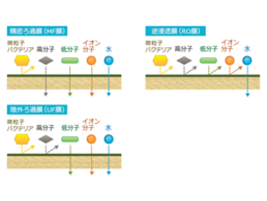 膜の種類や使用方法により分離できる物質の大きさが異なり、懸濁物質や細菌、微粒子を分離する精密ろ過膜、たんぱく質や酵素、細菌類やウィルスなどを分離する限外ろ過膜、さらに小さな低分子化合物やイオンなどを分離する逆浸透膜があります。