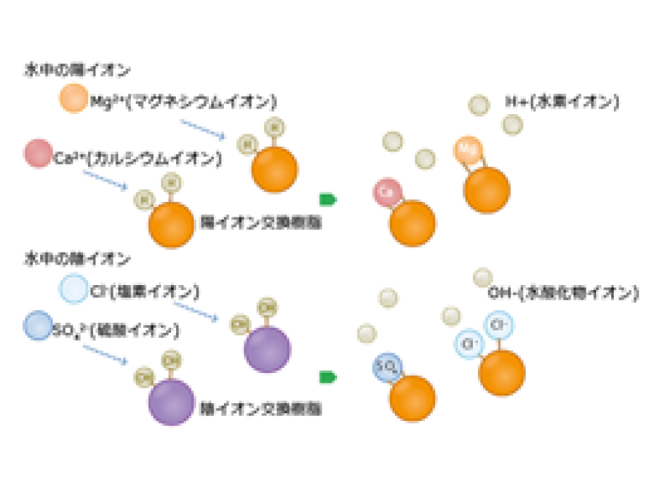 イオン交換樹脂や電気脱イオン装置などを用いて、除去するカルシウム、ナトリウム、硫酸などの物質は水中でプラスやマイナスの電気を帯び、カルシウムイオン、ナトリウムイオンなどの陽イオン(プラスに帯電したイオン)や硫酸イオンなどの陰イオン(マイナスに帯電したイオン)として溶解しています。