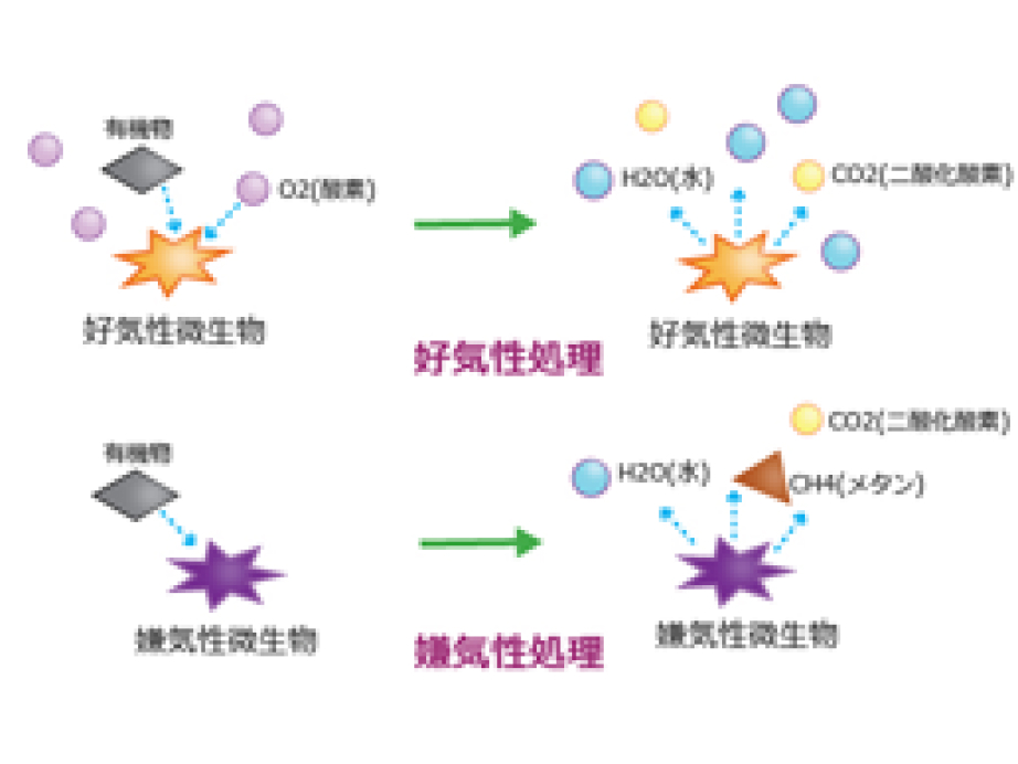 メタン発酵などの生物代謝を利用したエネルギーを創出するたとえば、排水処理には、水中に酸素が存在する条件下のみで生存できる好気性微生物による処理(好気性生物処理)と、酸素が存在しない条件下で生存できる嫌気性微生物による処理(嫌気性生物処理)があります。好気性生物処理では、微生物が水中に溶解している酸素を使って排水中に含まれる有機物を炭酸ガスと水に分解します。また、嫌気性生物処理では、水中に酸素が溶解していない環境で微生物が有機物をメタンガスと炭酸ガス、水に分解してメタンガスを燃料として回収します。