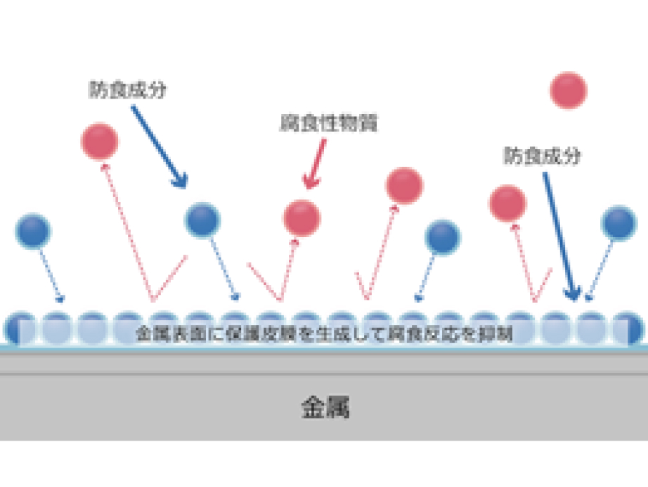 防食技術は、添加した薬品の成分が、腐食の原因となる溶存酸素や腐食を促進するイオンなどと反応して異なる物質に変えることで、腐食の要因を除去したり、薬品の成分と金属との反応によって生成した物質が、金属表面を覆う皮膜を形成することで腐食を抑制する技術です。