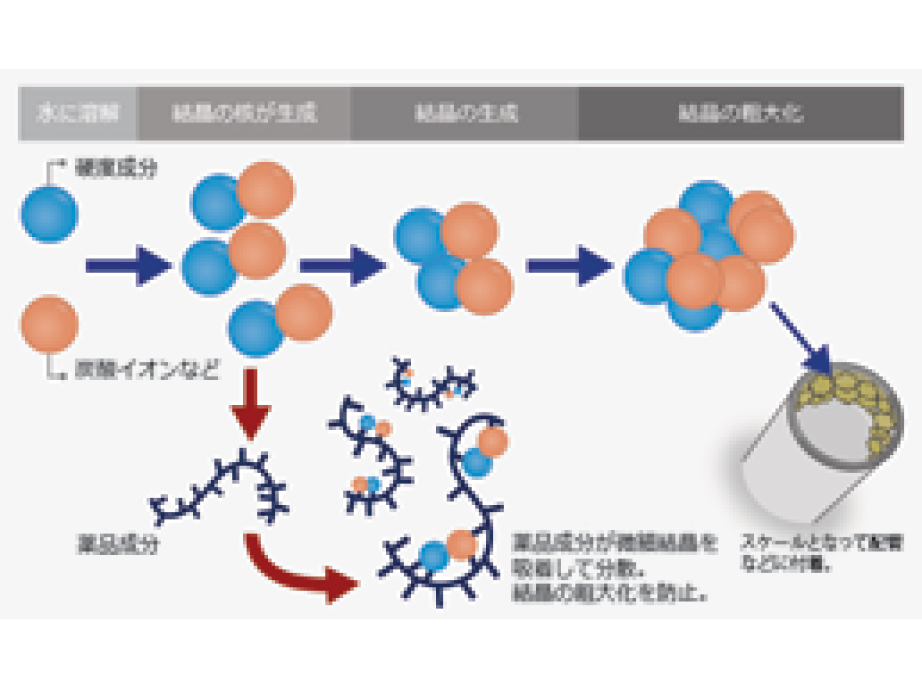 分散技術は、添加した薬品の成分が、析出し始めた微細な結晶に吸着し、結晶同士が集まり粗大化することを阻害して分散した状態を維持する技術です。