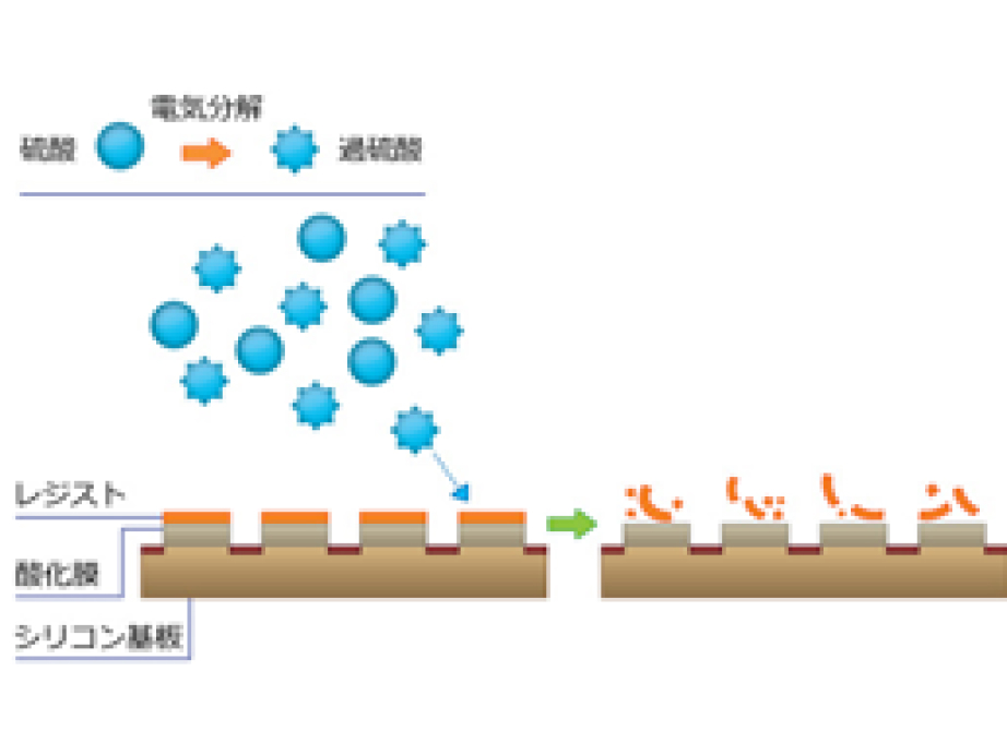 半導体や液晶等の製造では、半導体の基板や液晶のガラスパネルの表面に付着した微粒子等を超純水と薬液によって洗浄する、ウェット洗浄工程があり、従来は大量の薬液を使用して洗浄していました。これに対し、特定のガスを超純水に溶かすことで、洗浄効果の向上に加え、基板表面の酸化による安定化や基板の静電気抑制を可能とした機能性洗浄水による表面処理技術が注目されています。水素ガスやオゾンガスなどを溶解した機能性洗浄水を用いることで、薬液を大幅に削減可能です。また、半導体の回路を形成する際に用いられ、回路の形成後に除去されるレジストと呼ばれる樹脂は、大量の薬剤を用いて剥離しています。このレジスト剥離にクリタが開発したレジスト分解効果の高い電気分解した硫酸(電解硫酸)を用いることで、従来より大幅に薬液使用量を削減することができます。
