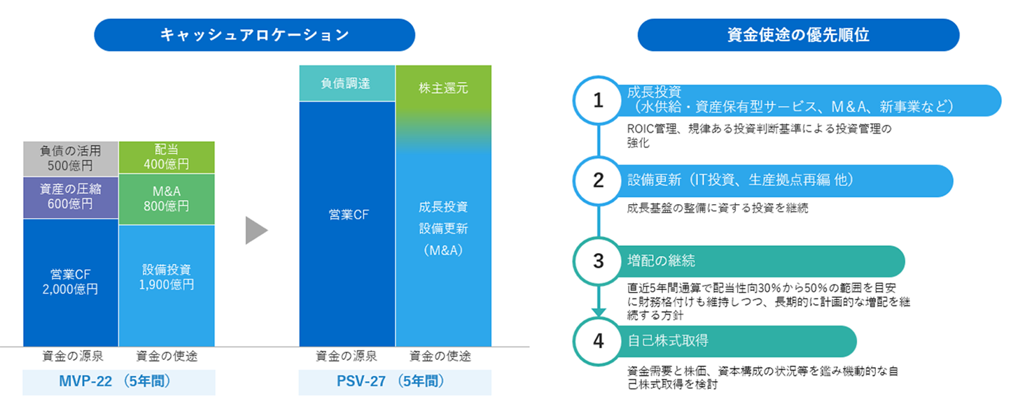 PSV-27計画以降も視野に入れ成長投資を優先して実施し、必要に応じて負債調達も検討します。また、株主還元を引き続き重視し、機動的な自己株式取得も検討します。