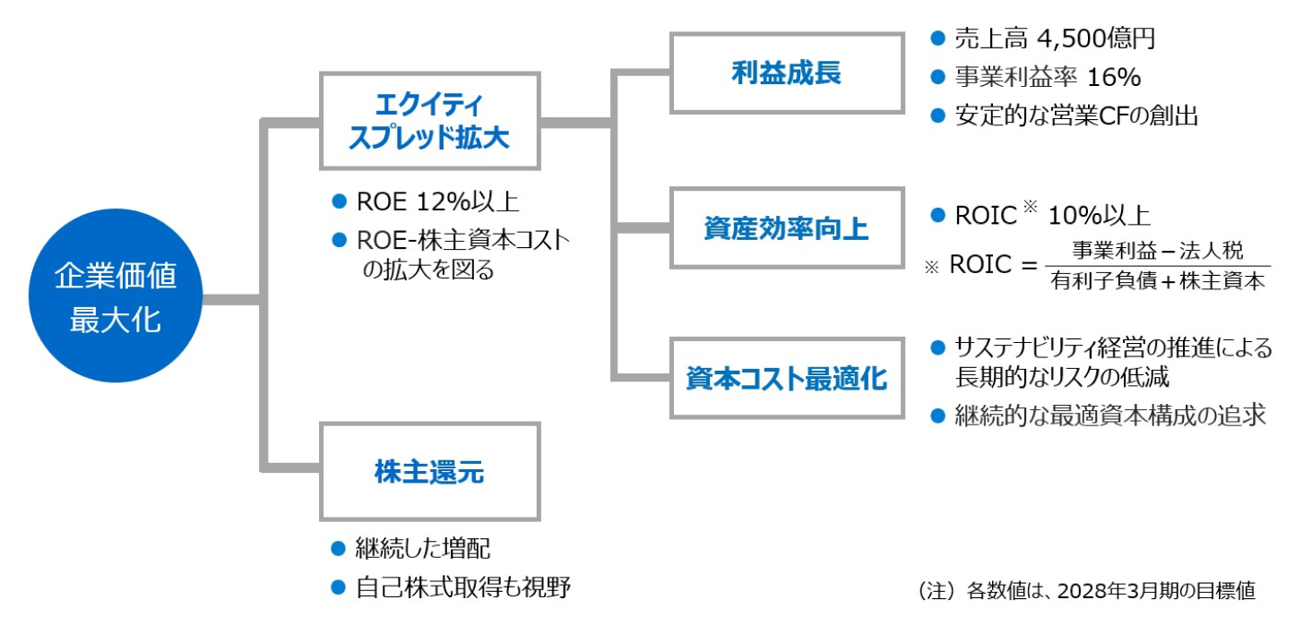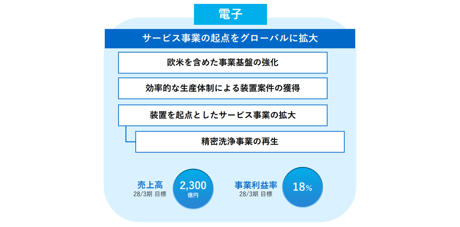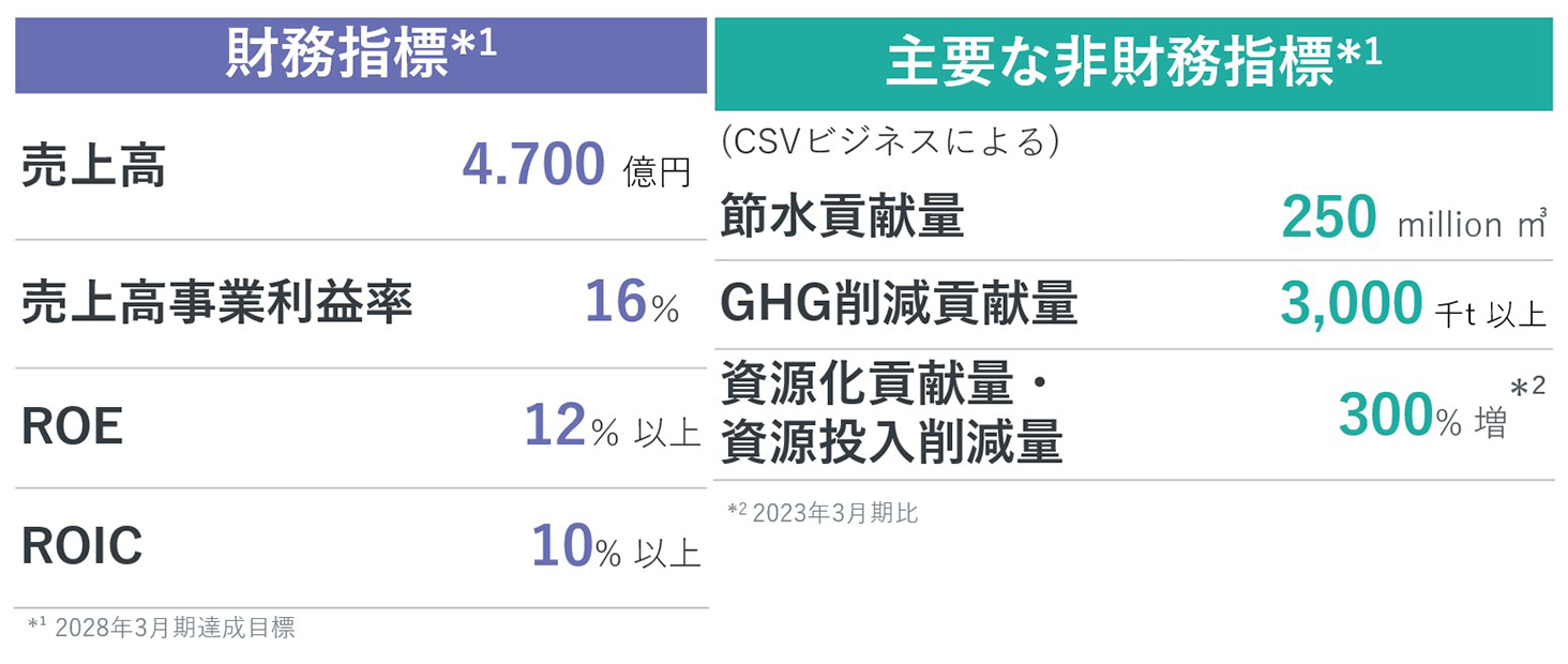 成長戦略である、①サービス事業の多様化と深化、②事業を通した社会との共通価値創造の強化、③DXの加速とデジタル技術の活用の3つの施策を、「電子」と「一般水処理」という特性が異なる2つの市場に特化した専門組織が、最適な形でスピーディに展開していくことにより、売上高4,700億円、売上高事業利益率16%の達成を目指します。 また、これらの成長戦略の推進を支える戦略的投資を積極的に実施しつつ、投資対効果を重視した経営を実施すべく、ROIC10%以上を目標値と定め、全社的に投資効率を意識した事業活動を推進していきます。さらに、収益性改善と株主還元の充実を図り、ROEの拡大にも取り組みます。