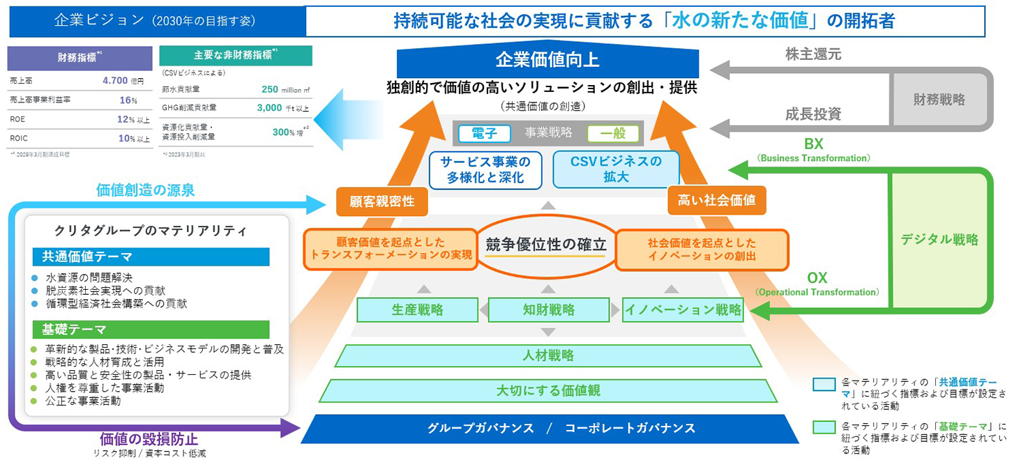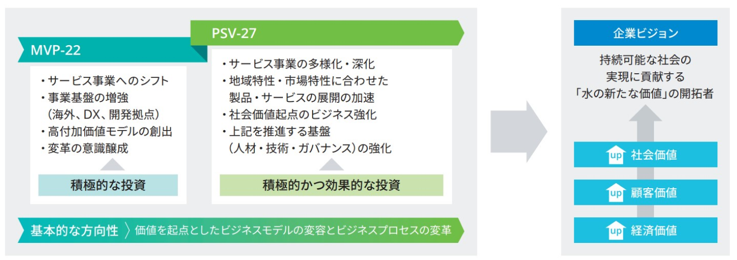 PSV-27計画では、顧客価値起点のトランスフォーメーションの実現と社会価値起点のイノベーションの創出の2軸の競争戦略を通じて、企業ビジョンが目指す、社会への高い価値の提供と高収益企業への成長を図ります。そのため、企業ビジョン実現のための重要課題であるクリタグループのマテリアリティがPSV-27計画の中に有機的に組み込まれており、ビジョン実現への道筋を「Value Pioneering Path」として定めています。