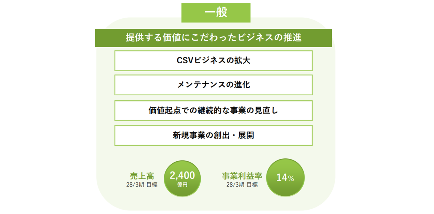 顧客産業のすそ野が広く、ビジネスモデルの転換による成長余力が期待できるこの市場に対しては、地域・市場特性に適した事業展開を可能とする体制を構築し、社会や顧客への提供価値の高いCSVビジネスのさらなる拡大と、その展開を加速するためのデジタル基盤の活用に取り組みます。加えて、循環型経済社会構築に貢献する新規事業への挑戦も進めます。