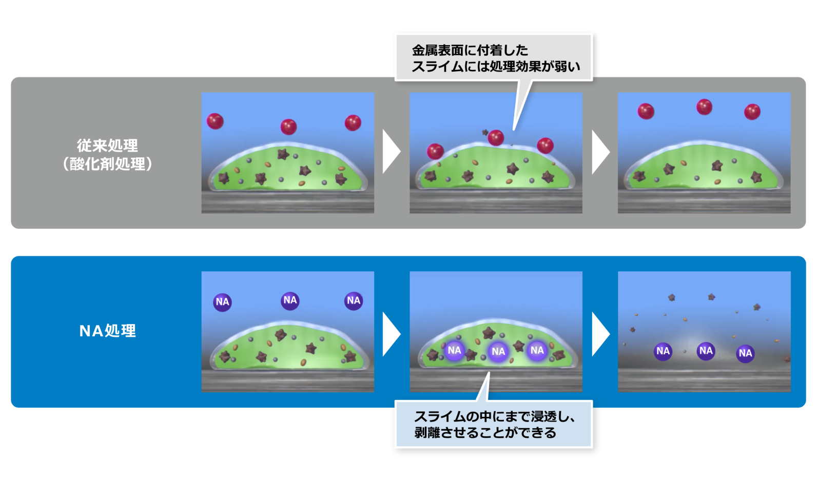 三大障害の予防に加え、レジオネラ属菌の増殖を抑制する「Kurita NA™」シリーズは、冷凍機の熱交換器へのスライム付着による熱伝達率の低下を防ぐことで、電力使用量の低減とGHG排出削減を実現します。また、炭酸カルシウムなど硬度成分の濃縮によるスケールの発生を抑制し、冷却水の濃縮倍数を高くすることで、補給水量やブロー水量の削減による節水にも寄与します。さらに、レジオネラ属菌の生菌率を10分の1にする高い効果を有しており、衛生的な設備環境を維持します。