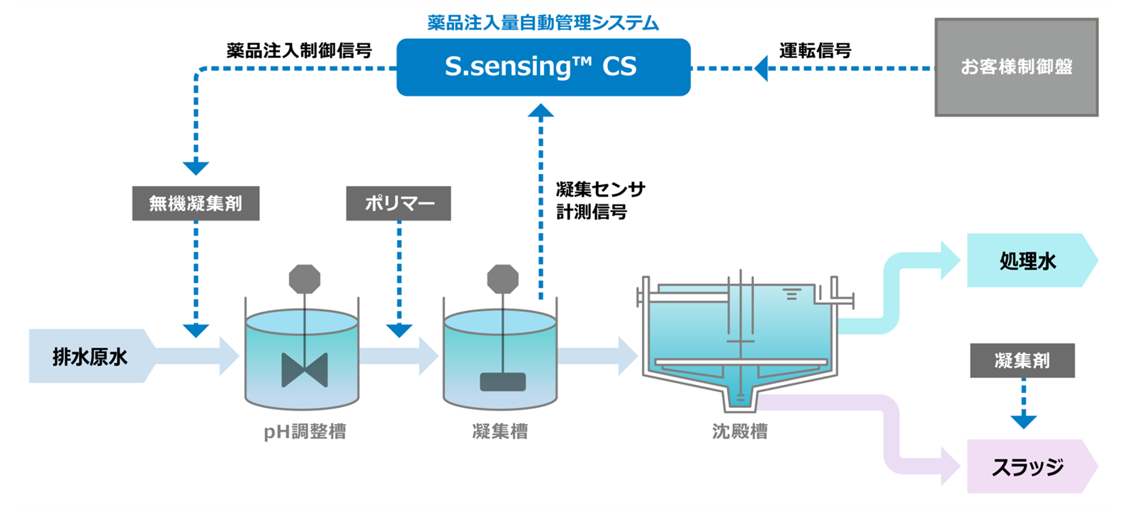 独自のセンサーを用いて排水処理薬品の注入量を自動で最適化する「S.sensing™ CS」は、排水の水質変動に応じて薬品注入量を過不足なく自動かつリアルタイムで制御し、排水処理の安定化による安定操業、ならびに薬品コストと薬品由来の汚泥発生量(資源投入量)の削減を実現します。また、運転状況をオンラインで遠隔監視することで、運転管理業務の省力化にも貢献します。