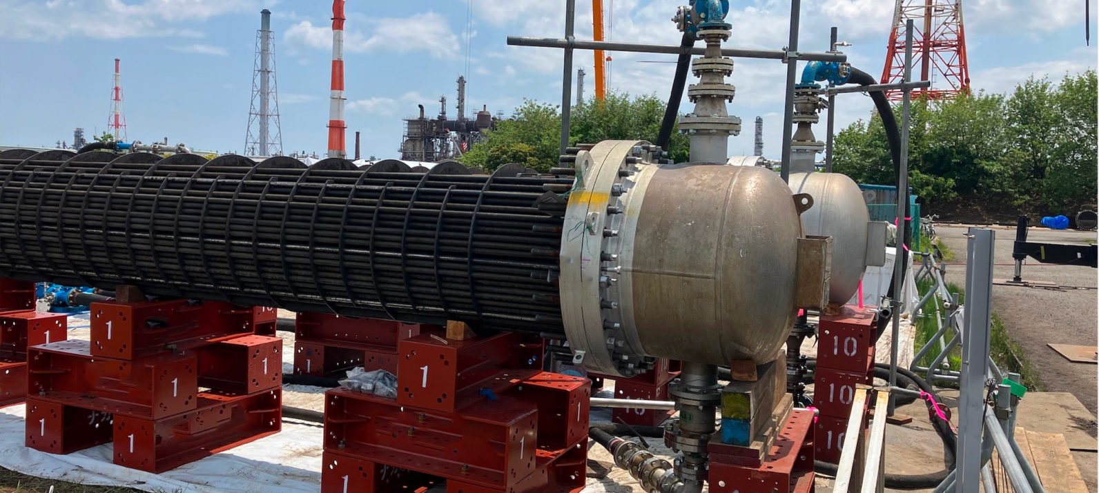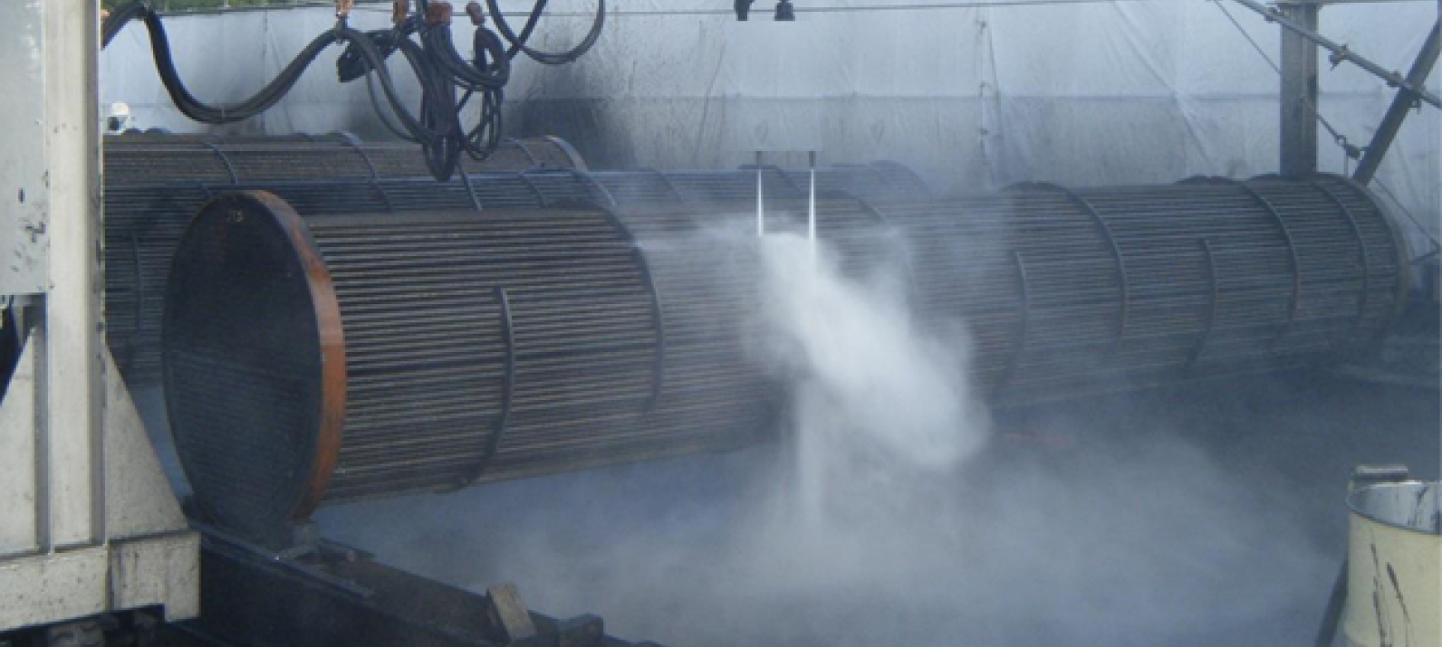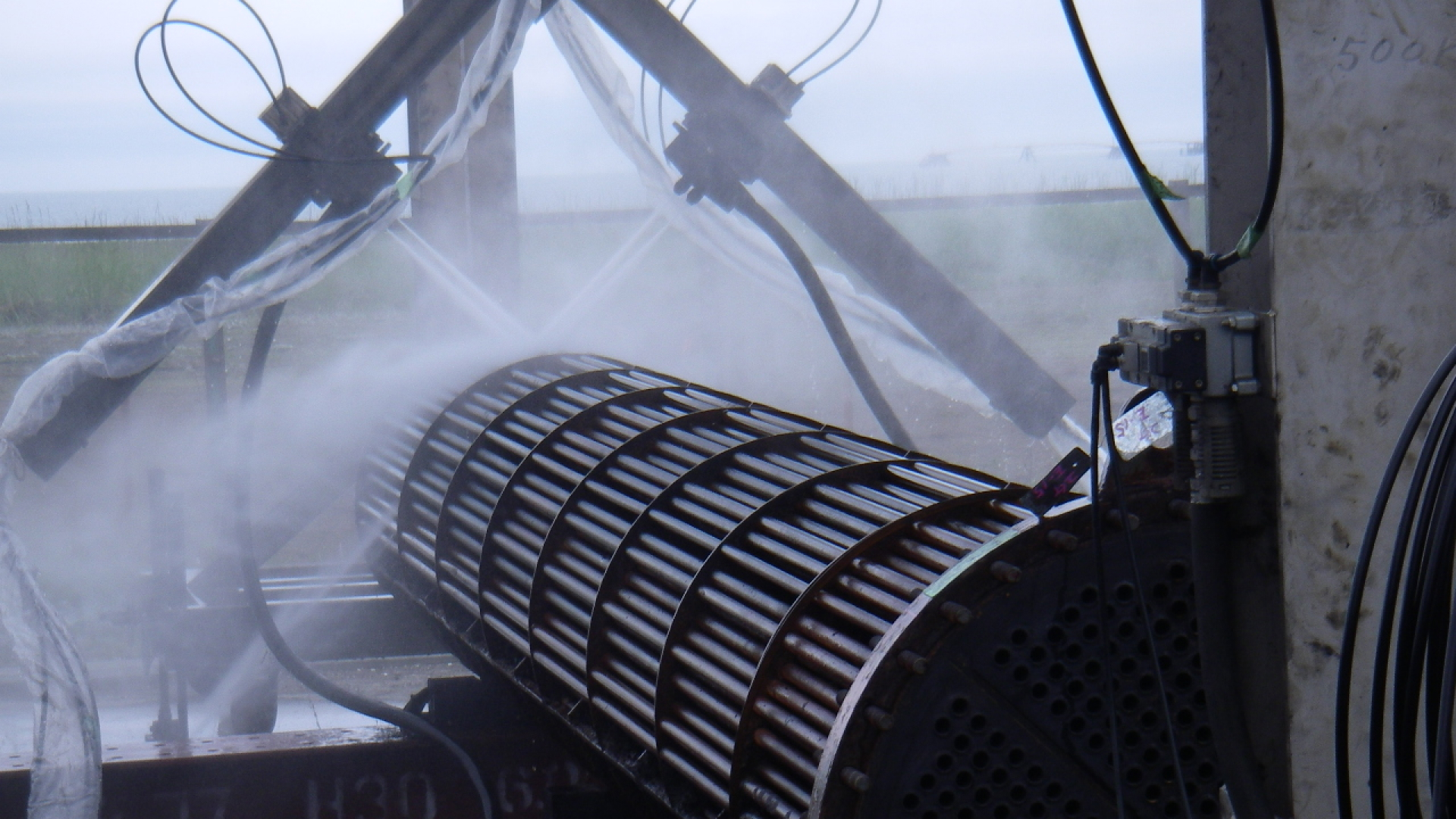 石油精製プラントの熱交換器への油汚れの付着は、熱伝達率の低下によるエネルギーロスを引き起こす要因となります。このような汚れを除去する手段として、一般的には高圧水によるジェット洗浄が用いられます。しかし、この方法はバンドル部の汚れの除去に手間がかかることに加え、人手でノズルを直接操作するため、作業環境における安全性が課題となっています。