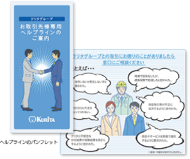 当社は、「内部通報等窓口運用規程 」を定め、不正行為の早期発見に努めています。本規程に基づき、取引先の利用が可能な、社外機関を活用した相談および通報窓口も設置しています。また、取引先がクリタグループとの取引の中で抱える不安や悩みなどを相談することのできる「お取引先様専用ヘルプライン」も開設しています。