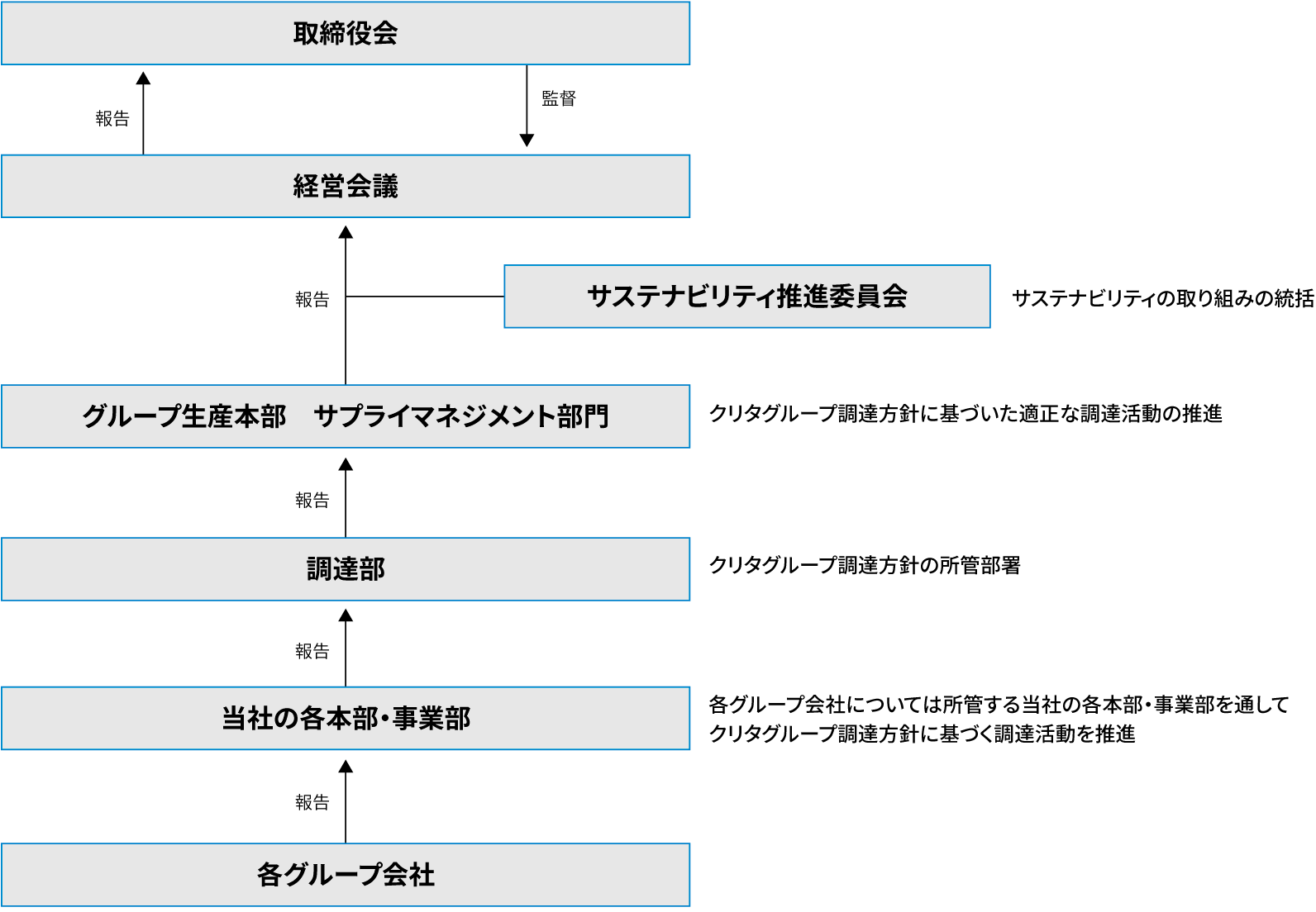 クリタグループでは、「クリタグループ調達方針」に基づき、適正な調達活動に取り組んでいます。推進・ガバナンス体制としては、当社のグループ生産本部 サプライマネジメント部門長を推進責任者とし、グループ会社については各社を所管する当社の各本部・事業部を通して方針に基づく調達活動を推進しています。