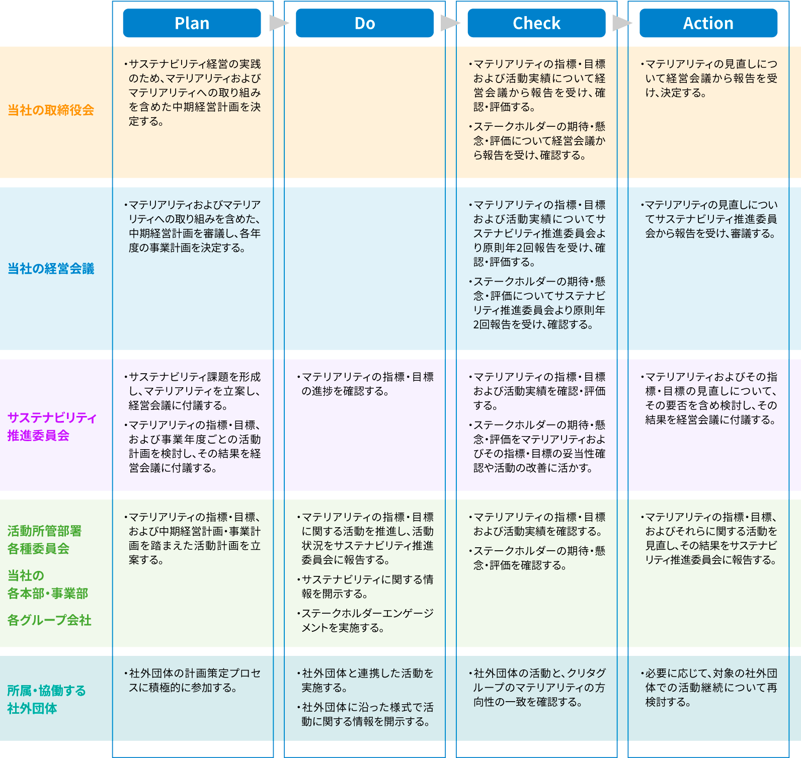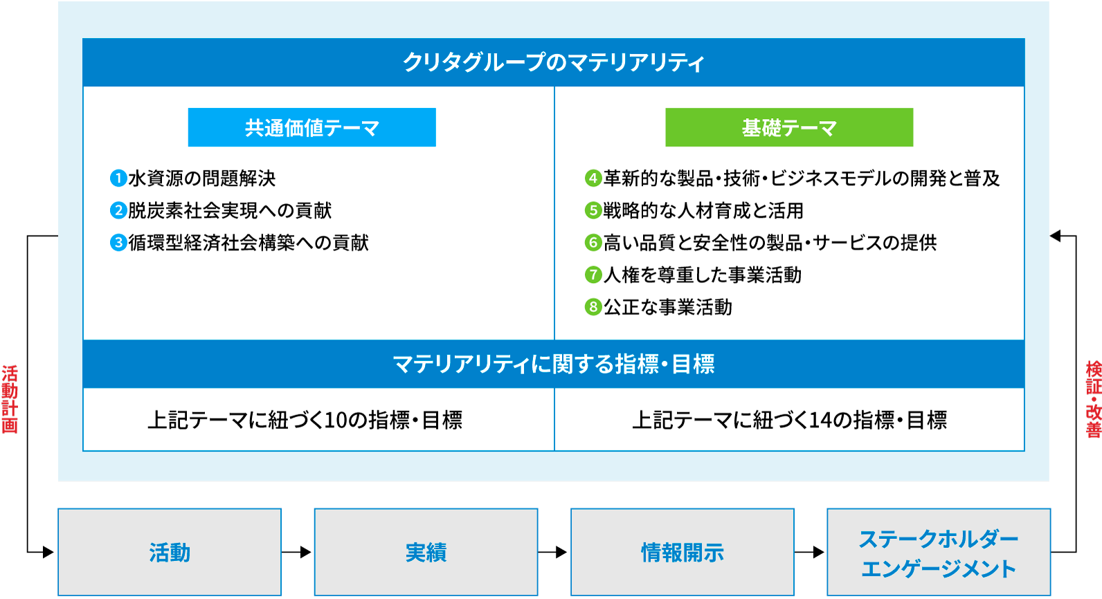 クリタグループは、「クリタグループのマテリアリティ」およびその指標・目標に関する諸活動ごとにグループ統一の中期目標と事業年度ごとの目標を策定します。事業年度ごとの活動計画や必要に応じた指標・目標の改定は、活動所管部署が立案し、サステナビリティ推進委員会で討議のうえ経営会議で決定します。活動実績の評価は、サステナビリティ推進委員会および経営会議で行います。