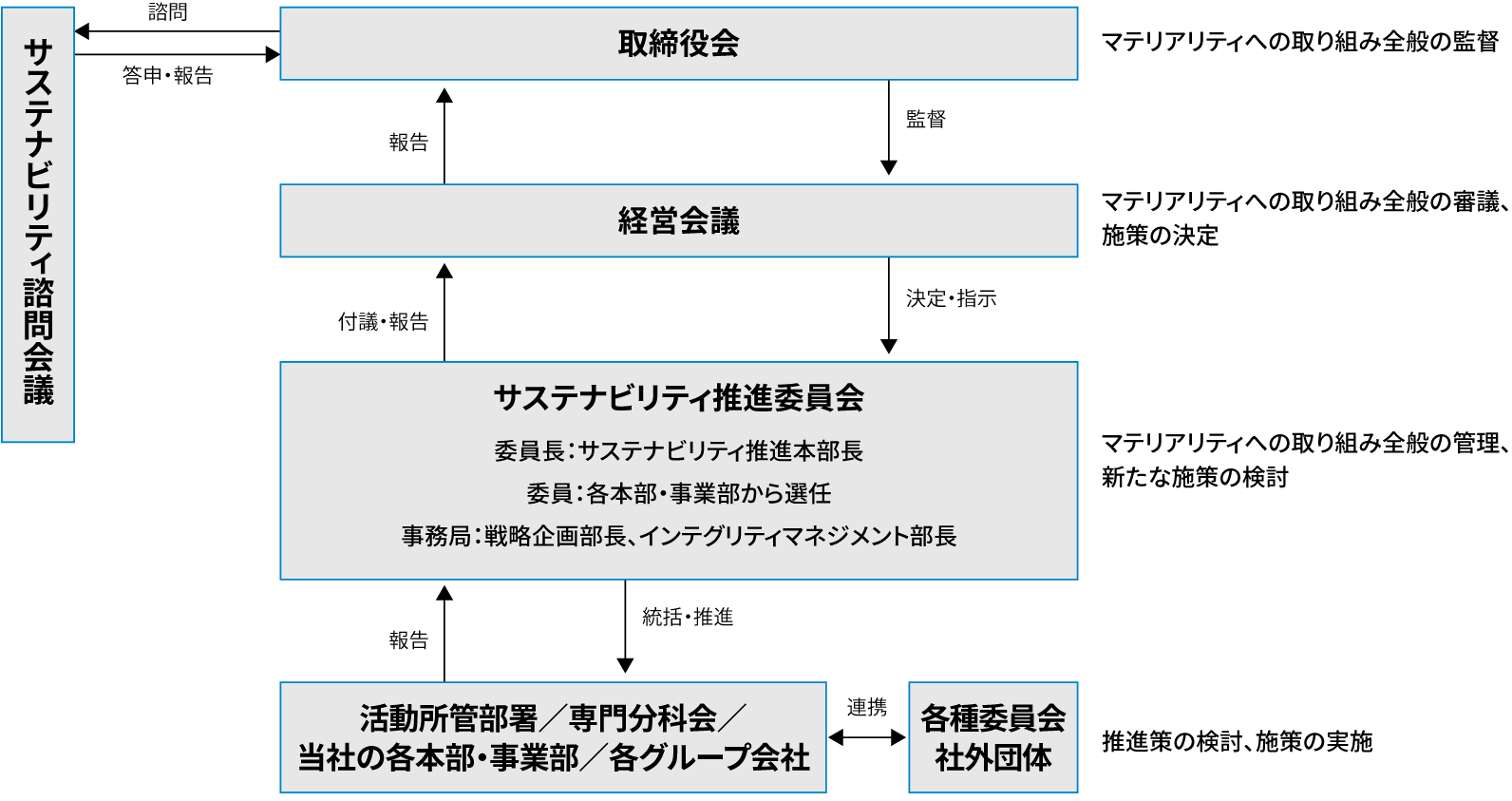 クリタグループは、当社の執行役員であるサステナビリティ経営戦略室長を委員長とするサステナビリティ推進委員会が、グループにおけるマテリアリティへの取り組みを統括、推進しています。サステナビリティ推進委員会は、取り組み状況を原則年2回経営会議へ付議または報告することとしており、経営会議はその内容を審議し必要な施策を決定します。また、経営会議は取り組み状況を、マテリアリティの取り組み全般の監督を担う取締役会へ報告しています。サステナビリティ諮問会議はサステナビリティを取り巻く国内外の情勢を踏まえ、マルチステークホルダー視点、中長期的視点からサステナビリティ経営に関する当社の在り方を検討、審議し、取締役会へ答申、報告しています。