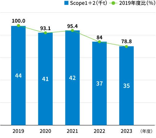 Scope1+2は、その大半はScope2の電力由来のGHG排出であるため、再生可能エネルギーの採用や再エネ証書等の購入を進めるとともに、ガソリン車から電気自動車やハイブリッド車に順次切り替えています。2023年度は、主に電力由来のGHG排出量が多い国内の拠点において再生可能エネルギーの採用を進めたことなどから、基準年である2019年度比でScope1+2は21.2%削減となり、目標を達成しました。