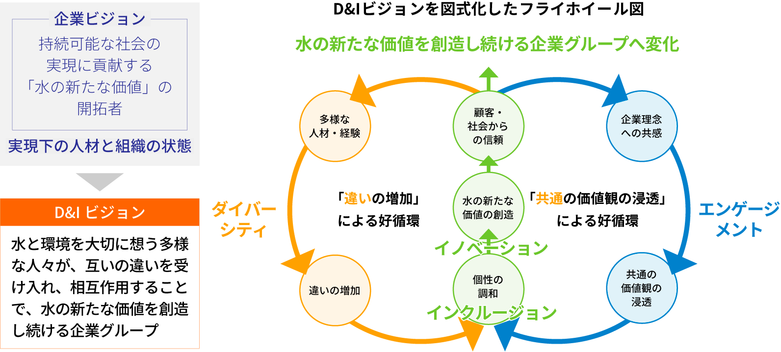 クリタグループは、企業ビジョン実現下の人材と組織の状態をD&Iビジョンとして「水と環境を大切に想う多様な人々が、互いの違いを受け入れ、相互作用することで、水の新たな価値を創造し続ける企業グループ」と定めています。
