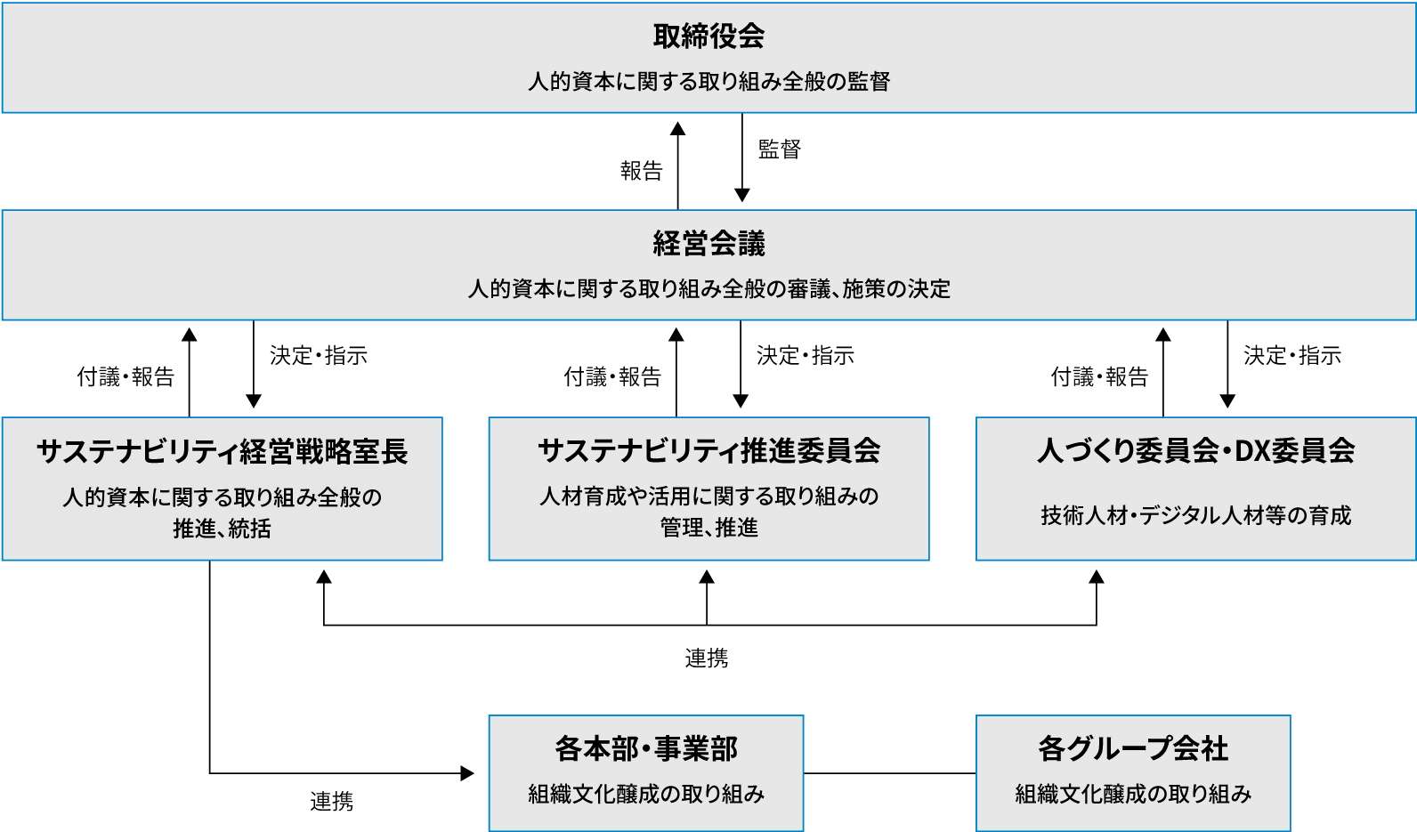 クリタグループは、当社の執行役員であるサステナビリティ経営戦略室長が人的資本に関する取り組み全般の推進と統括を行い、組織文化醸成に関する取り組みは、各本部・事業部およびグループ各社と連携し推進しています。また、人材育成や活用に関する取り組みは、サステナビリティ経営戦略室長を委員長とするサステナビリティ推進委員会が管理、推進するとともに、人づくり委員会やDX委員会と連携して推進しています。サステナビリティ経営戦略室長ならびにサステナビリティ推進委員会、人づくり委員会、DX委員会は、人的資本に関する取り組み状況を経営会議へ付議または報告し、経営会議はその内容を審議し必要な施策を決定します。また、経営会議は人的資本に関する取り組み状況を取締役会へ報告します。