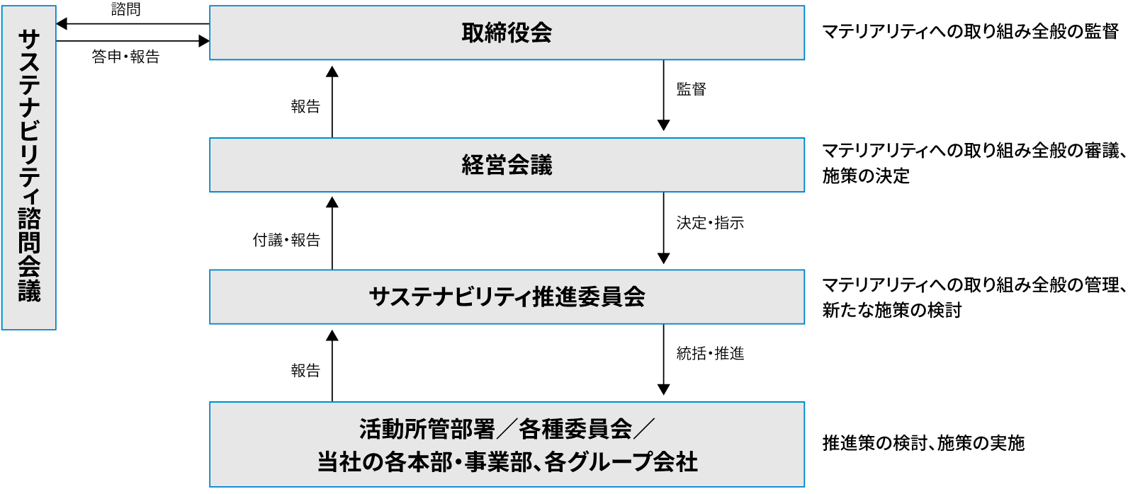クリタグループは、マテリアリティの一つに「高い品質と安全性の製品・サービスの提供」を定め、当社の執行役員であるサステナビリティ経営戦略室長を委員長とするサステナビリティ推進委員会が、グループにおける取り組みを統括、推進しています。サステナビリティ推進委員会は、取り組み状況を経営会議へ付議または報告することとしており、経営会議はその内容を審議し必要な施策を決定します。また、経営会議は取り組み状況を、取り組み全般の監督を担う取締役会へ報告しています。